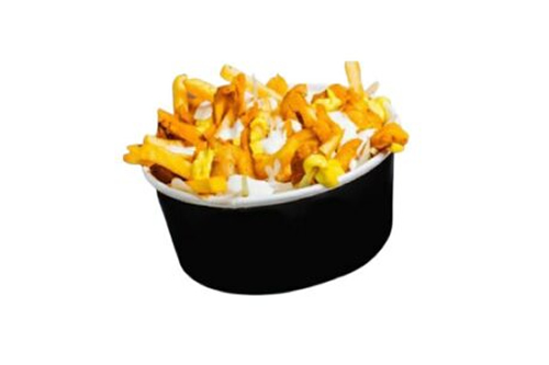 Frite, salade, tomate, oignon frits, viande au choix, sauce fromagère, sauce au choix.