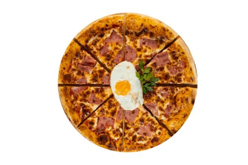 Sauce tomate, mozza, lardons, œuf.